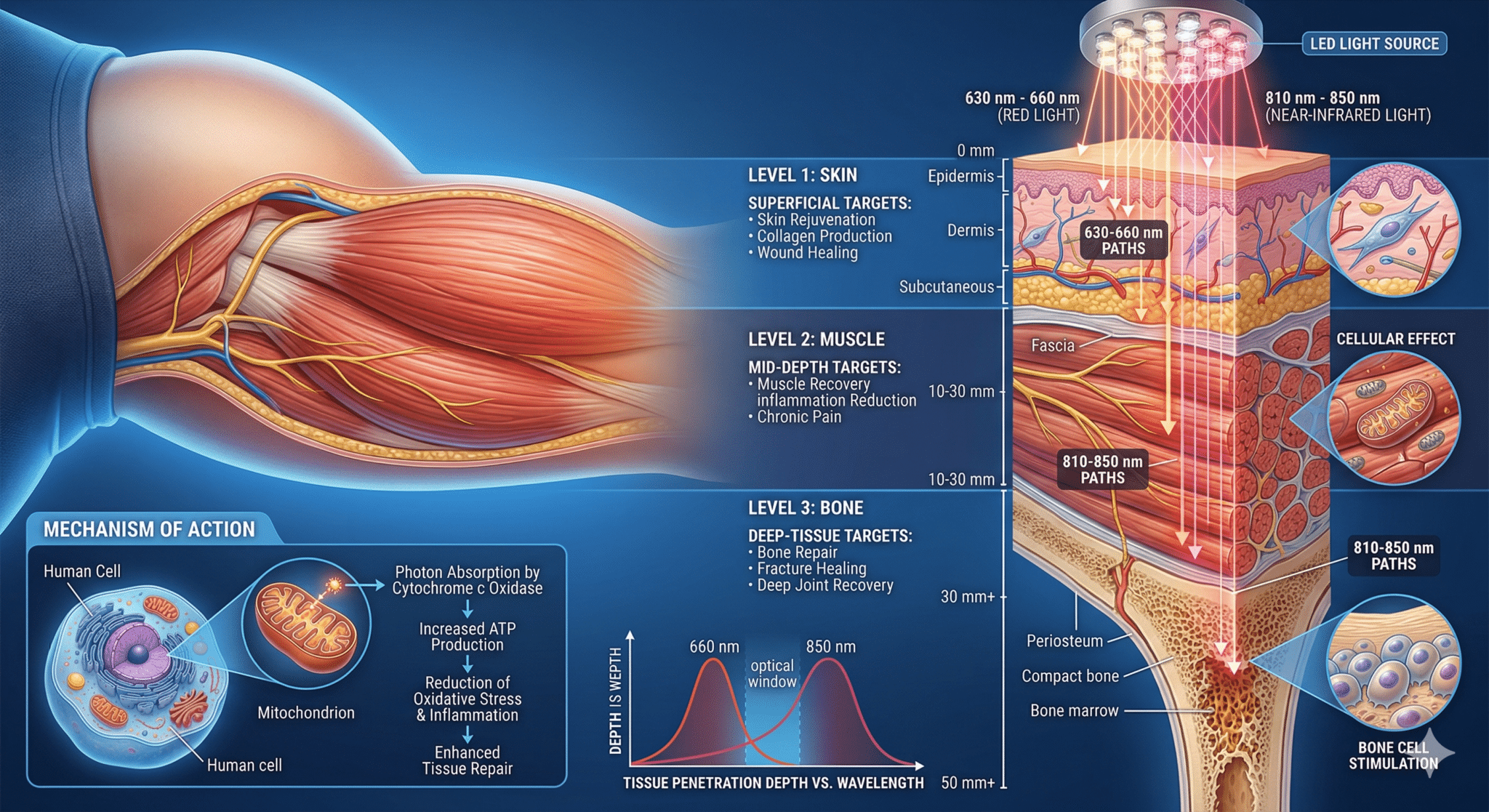 Red Light Therapy is a therapeutic technique that uses specific wavelengths of red (630–660 nm) and near-infrared light (810–880 nm) to stimulate cellular function. Unlike ultraviolet light, these wavelengths do not damage skin or tissue. Instead, they penetrate the body and interact with cells at a mitochondrial level.